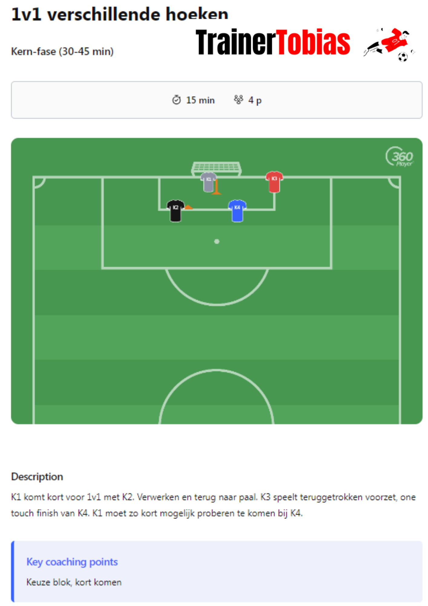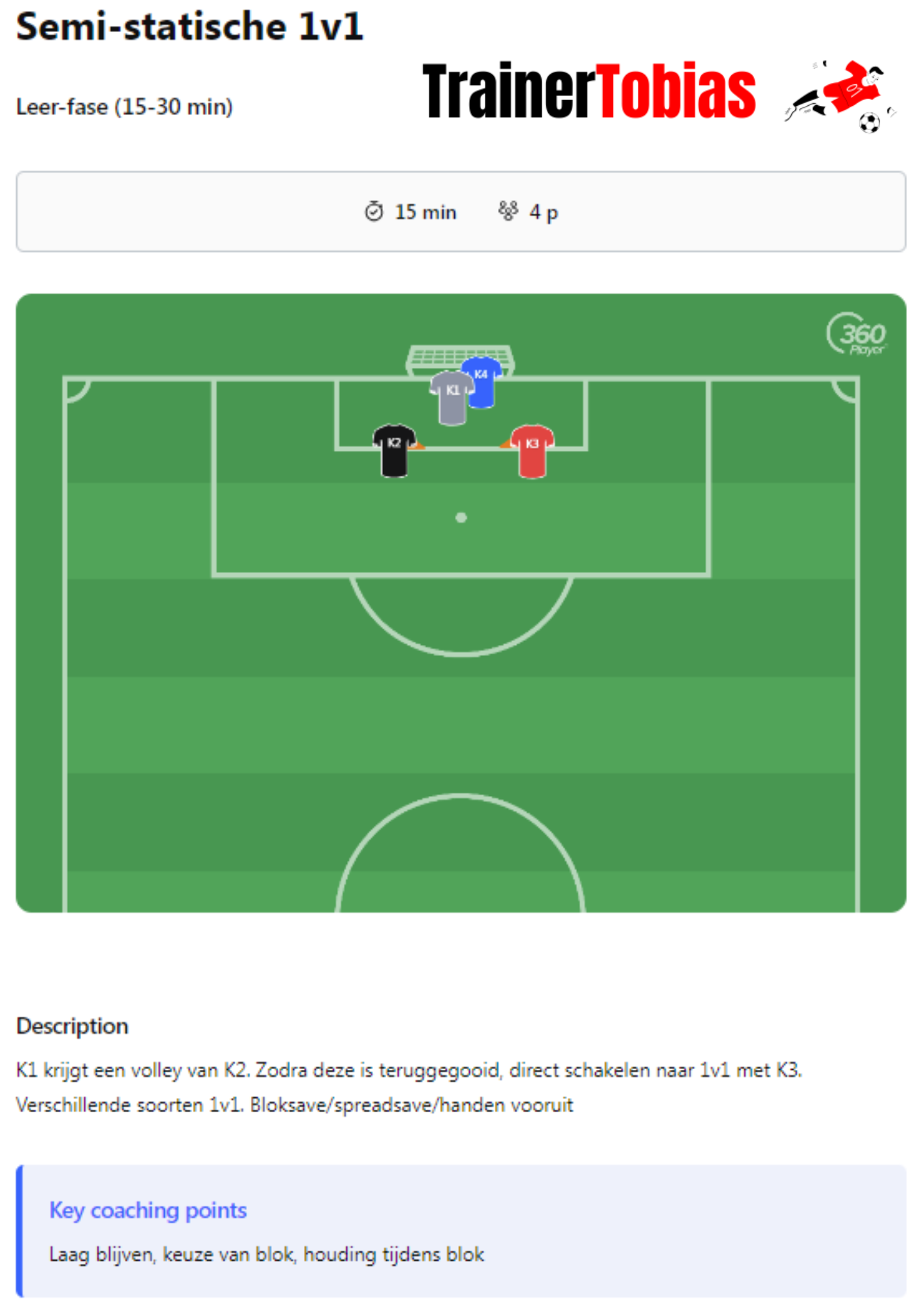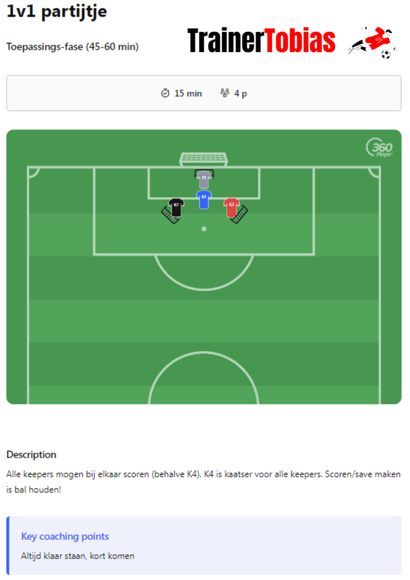 Op deze pagina vind je één volledige training volgens mijn eigen format (dat te vinden is onder 'structuur keeperstraining') en één extra oefening per fase in de training, de leer-, kern- en toepassingsfase.